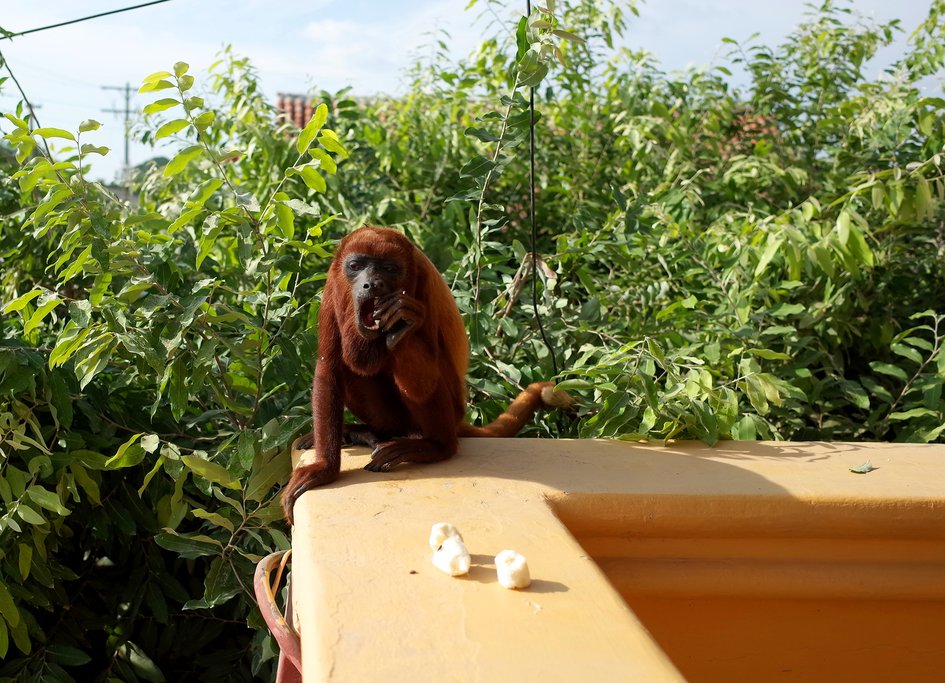 Red howler monkey enjoying a snack on a balcony in Mompox.