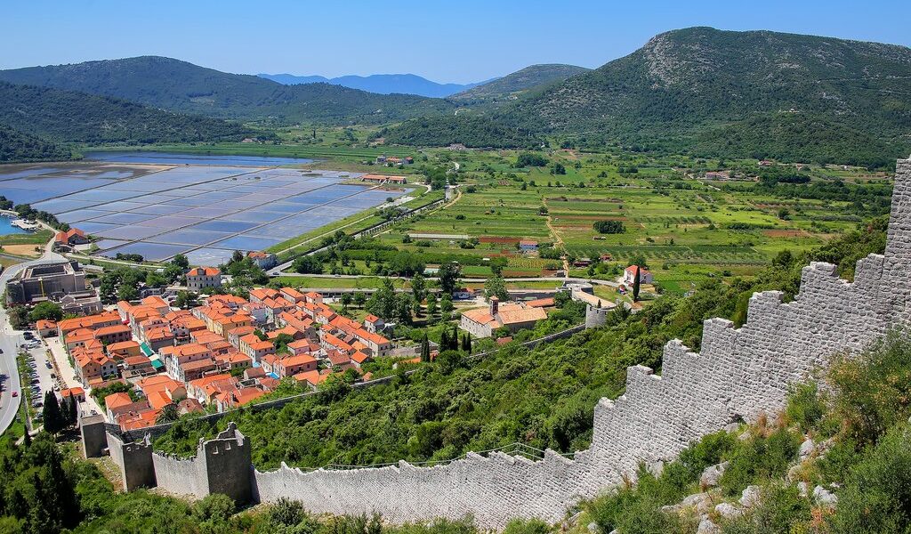 Ston’s other prominent attraction, its captivating salt flats, are situated just outside of the town center. Aerial views reveal strikingly beautiful squares of bluish-white, reflecting the sunlight as the salt crystals dry. Each year during the summer months, during the salt harvest, visitors have the unique opportunity to volunteer their assistance in this traditional process. At most other times of the year, the salt flats, officially known as Solana Ston, are open to visitors who wish to explore the area and purchase souvenir bags of locally produced salt to take home.