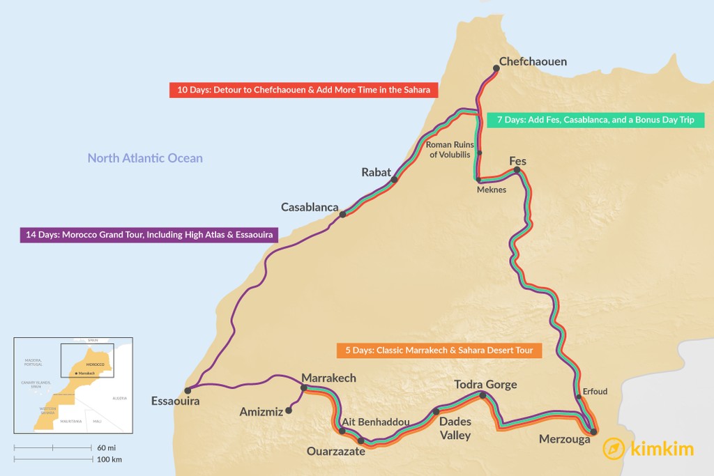 With ten days at your disposal, you can indulge in all the experiences offered by the seven-day itinerary, while also enjoying a more leisurely pace and additional opportunities for exploration. Spend more time basking in the vastness of the Sahara Desert, dedicate an extra day to uncovering the secrets of Marrakech, and embark on a side trip to the enchanting “Blue City” of Chefchaouen, a photographer’s paradise.